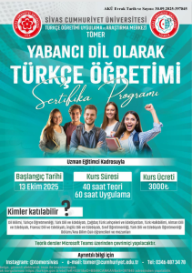 Sivas Cumhuriyet Üniversitesi Türkçe Öğretimi Uygulama ve Araştırma Merkezi tarafından 13 Ekim – 10 Kasım 2025 tarihleri arasında “Yabancı Dil Olarak Türkçe Öğretimi Sertifika Programı” düzenlenecektir.