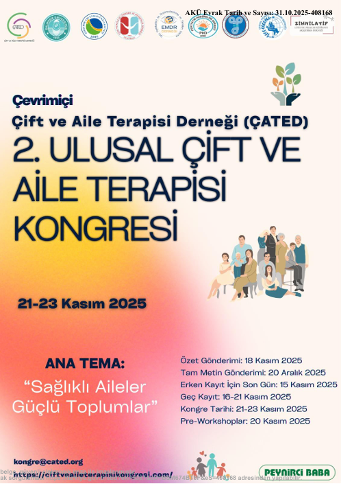 Balıkesir Üniversitesi Necatibey Eğitim Fakültesi Eğitim Bilimleri Bölümü Rehberlik ve Psikolojik Danışmanlık Anabilim Dalı ile Çift ve Aile Terapisi Derneği (ÇATED) tarafından; Balıkesir Üniversitesi ve Kırşehir Ahi Evran Üniversitesi iş birliği ile 21-23 Kasım 2025 tarihleri arasında “II. Ulusal Çift ve Aile Terapisi Kongresi” düzenlenecektir.