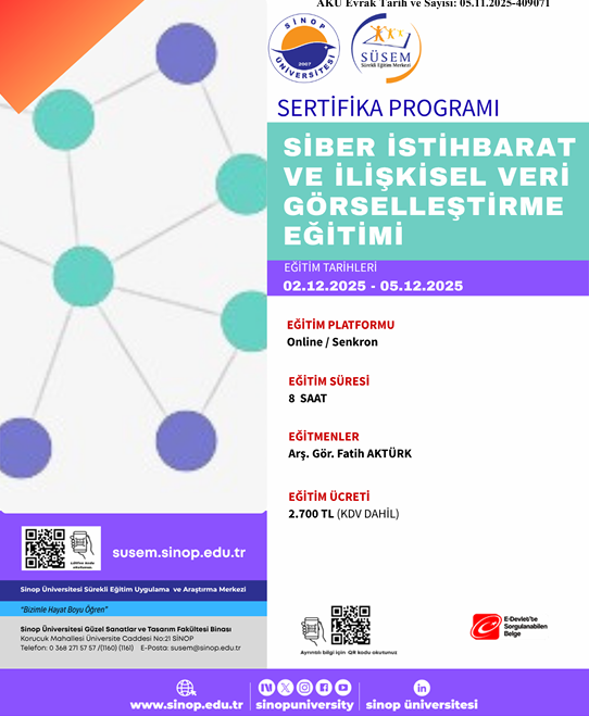 Sinop Üniversitesi Sürekli Eğitim Uygulama ve Araştırma Merkezi Müdürlüğü bünyesinde “Siber İstihbarat ve İlişkisel Veri Görselleştirmesi Eğitimi” düzenlenecektir.