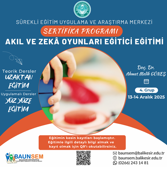 Balıkesir Üniversitesi Sürekli Eğitim Uygulama ve Araştırma Merkezi eğitim faaliyetleri kapsamında, “Akıl ve Zekâ Oyunları Eğitici Eğitimi Sertifika Programı” eğitimi verilecektir.