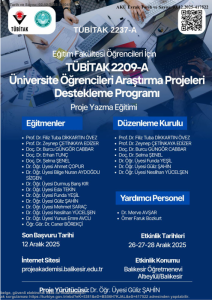 Balıkesir Üniversitesi Necatibey Eğitim Fakültesi Temel Eğitim Bölümü Sınıf Eğitimi ABD öğretim elemanı olarak TÜBİTAK-BİDEB 2237-A Bilimsel Eğitim Etkinliklerini Destekleme Programı kapsamında desteklenen “Eğitim Fakültesi Öğrencileri İçin “TÜBİTAK 2209-A Üniversite Öğrencileri Araştırma Projeleri Destekleme Programı Proje Yazma Eğitimi” başlıklı proje, 26-27-28 Aralık 2025 tarihlerinde yüz yüze Balıkesir’de gerçekleştirilecektir.