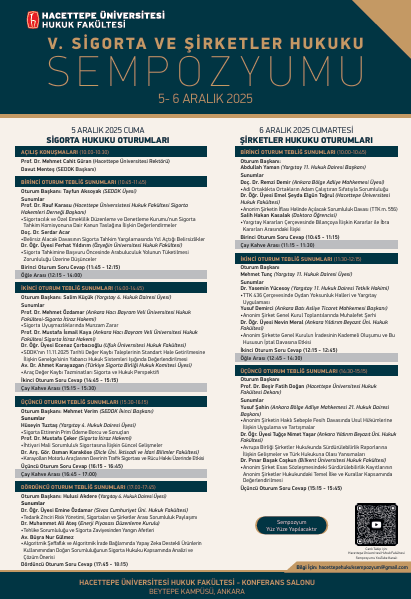Hacettepe Üniversitesi Hukuk Fakültesi Ticaret Hukuku Ana Bilim Dalı tarafından 05-06 Aralık 2025 tarihlerinde, Yargıtay 4. ve 11. Hukuk Daireleri, Sigortacılık ve Özel Emeklilik Düzenleme ve Denetleme Kurumu ile Türkiye Sigorta Birliğinin katkılarıyla “V. Sigorta ve Şirketler Hukuku Sempozyumu” düzenlenecektir.