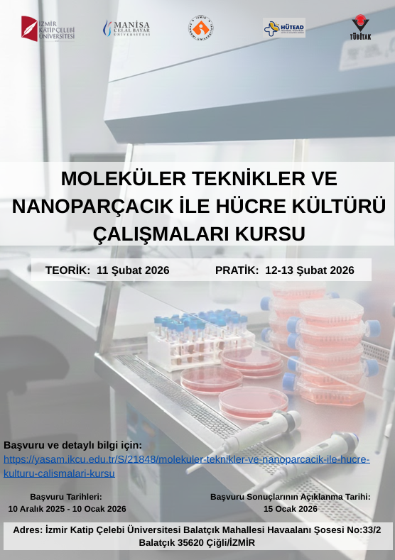 TÜBİTAK 2237 Eğitim Etkinlikleri Destekleme Programı kapsamında İzmir Katip Çelebi Üniversitesi Hücre, Doku ve Organ Nakli Uygulama ve Araştırma Merkezi ev sahipliğinde Tıp Fakültesi, Manisa Celal Bayar Üniversitesi, İzmir Ekonomi Üniversitesi ve Hücresel Tedaviler Eğitim ve Araştırma Derneği tarafından 11-13 Şubat 2026 tarihlerinde “Moleküler Teknikler ve Nanoparçacık ile Hücre Kültürü Çalışmaları” kursu gerçekleştirilecektir.