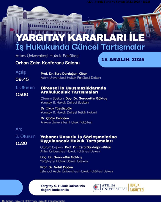 Atılım Üniversitesi Hukuk Fakültesinin Yargıtay 9. Hukuk Dairesi Başkanlığının katkılarıyla 18 Aralık 2025 tarihinde “Yargıtay Kararları ile İş Hukukunda Güncel Tartışmalar Konferansı” programı düzenlenecektir.