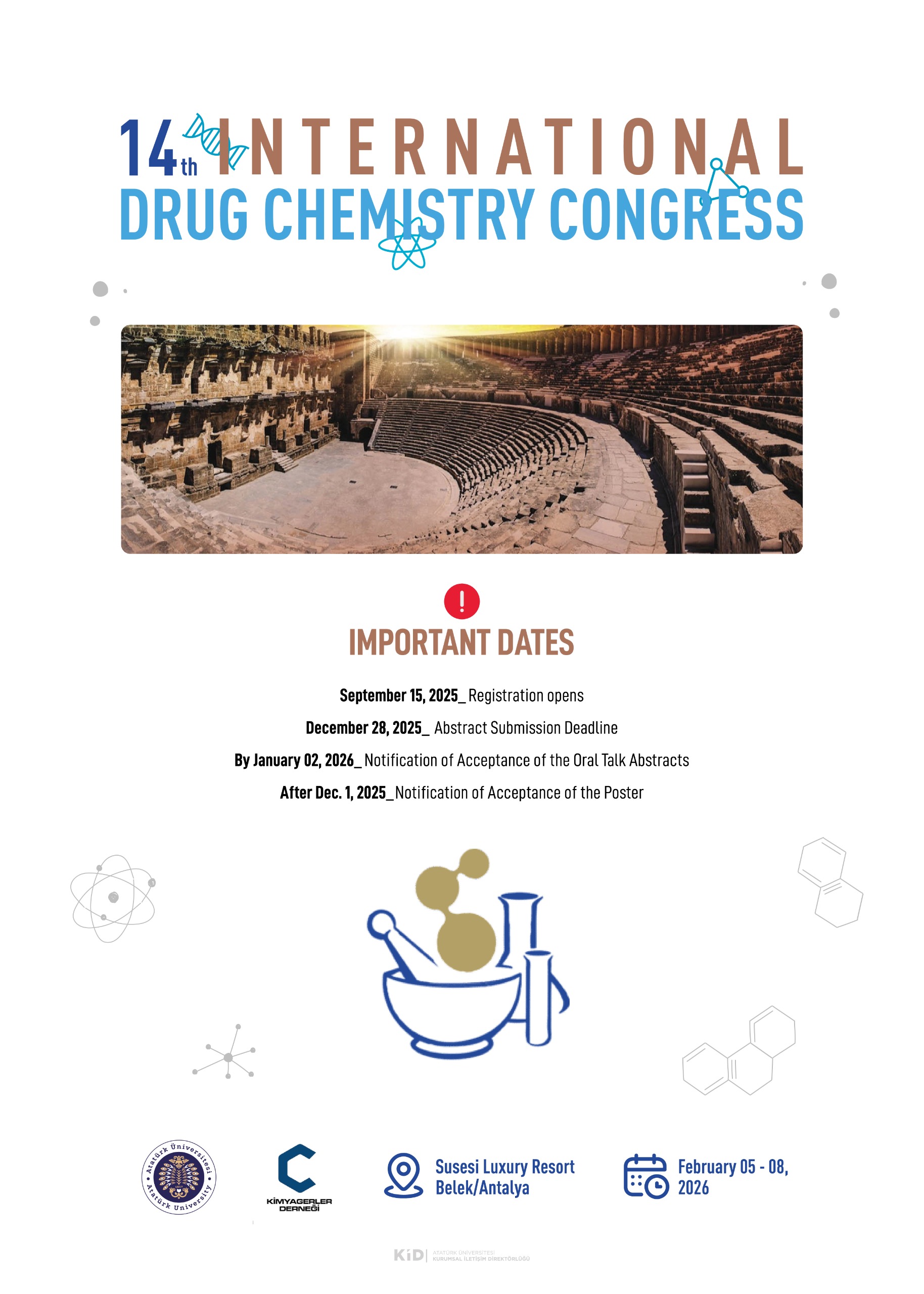 Atatürk Üniversitesi ve Kimyagerler Derneği iş birliği ile 05-08 Şubat 2026 tarihleri arasında “14. International Drug Chemistry Conference” düzenlenecektir.