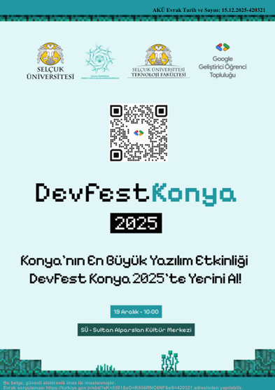 Selçuk Üniversitesi Teknoloji Fakültesi Dekanlığı Bilgisayar Mühendisliği Bölümü ile Google Geliştirici Öğrenci Topluluğu tarafından ortaklaşa bir şekilde “DevFest Konya 2025”  19 Aralık 2025 tarihinde 10.00 17.00 saatleri arasında düzenlenecektir.