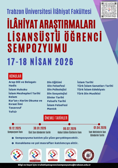 Trabzon Üniversitesi İlahiyat Fakültesi, TRÜ İslami İlimler Uygulama ve Araştırma Merkezi, TRÜ Kur’ân-ı Kerîm Araştırmaları ve Kıraat İlmi Enstitüsü ile Trabzon İlahiyat Fakültesi Derneği (TİFDER) iş birliğiyle, 17–18 Nisan 2026 tarihlerinde “İlahiyat Araştırmaları Lisansüstü Öğrenci Sempozyumu” düzenlenecektir.
