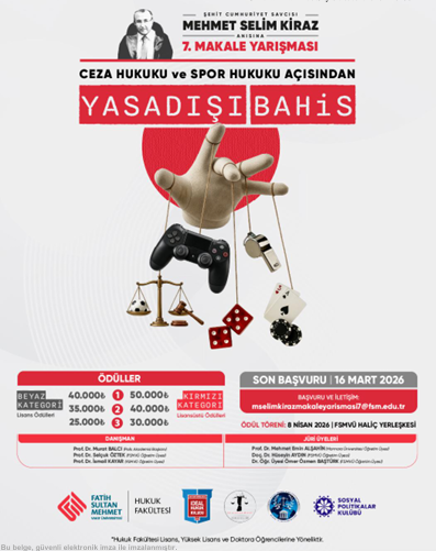 Fatih Sultan Mehmet Vakıf Üniversitesi Hukuk Fakültesi tarafından, Şehit Cumhuriyet Savcısı Mehmet Selim KİRAZ anısına “Ceza Hukuku ve Spor Hukuku Açısından Yasa Dışı Bahis” konulu 7. makale yarışması düzenlenecektir.