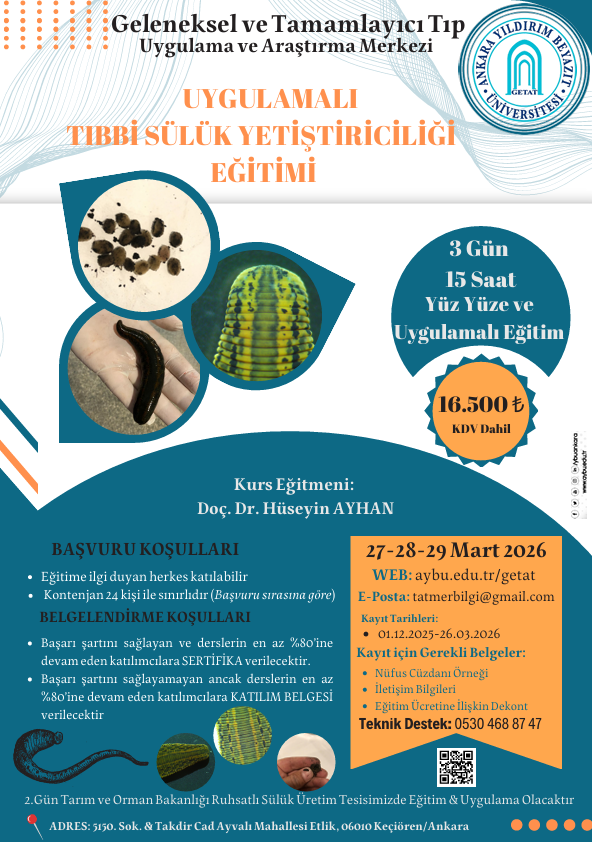 Ankara Yıldırım Beyazıt Üniversitesi  Geleneksel ve Tamamlayıcı Tıp Uygulama ve Araştırma Merkezi Müdürlüğü tarafından 27-28-29 Mart 2026 tarihlerinde yüz yüze “Uygulamalı Tıbbi Sülük Yetiştiriciliği” eğitimi düzenlenmesi planlanmaktadır.