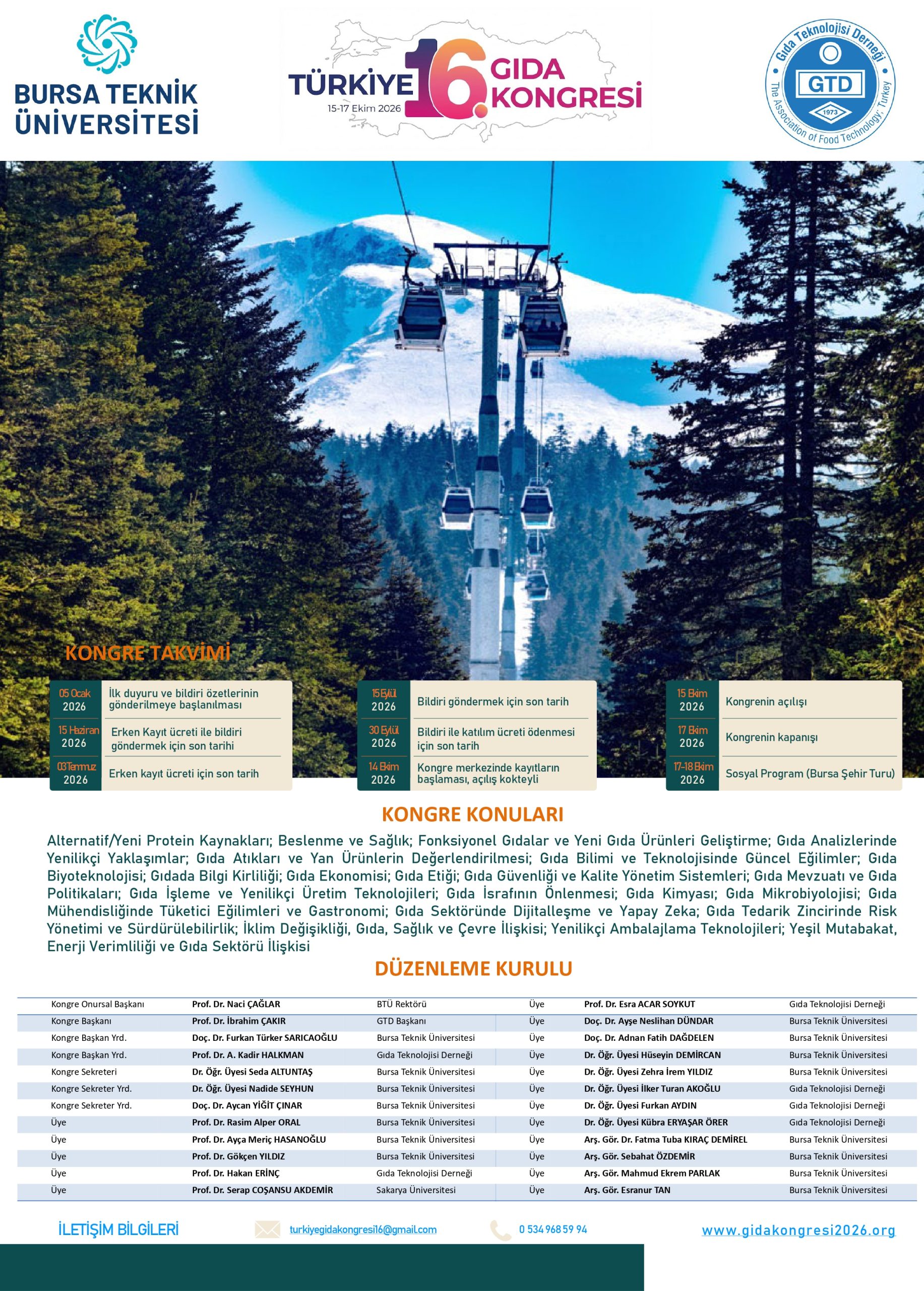Bursa Teknik Üniversitesi Gıda Mühendisliği Bölümü ve Gıda Teknoloji Derneği ortaklığında 15-17 Ekim 2026 tarihleri arasında Bursa’da “16.Gıda Kongresi” gerçekleştirilecektir.