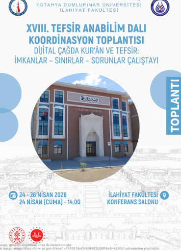 Kütahya Dumlupınar Üniversitesi İlahiyat Fakültesi tarafından 24-26 Nisan 2026 tarihleri arasında İlahiyat Fakültesi Konferans Salonunda ”XVIII. Tefsir Anabilim Dalı Koordinasyon Toplantısı”nın düzenlenmesi planlanmaktadır.
