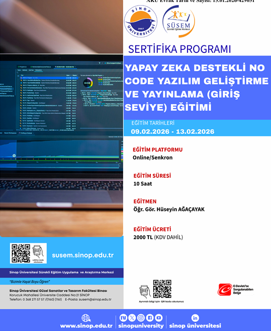 Sinop Üniversitesi Sürekli Eğitim Uygulama ve Araştırma Merkezi Müdürlüğü bünyesinde “Yapay Zeka Destekli No-Code Yazılım Geliştirme ve Yayınlama (Giriş Seviye) Sertifika Programı” gerçekleştirilecektir.
