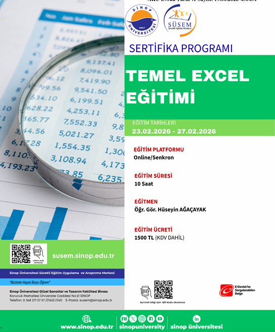 Sinop Üniversitesi Sürekli Eğitim Uygulama ve Araştırma Merkezi Müdürlüğü bünyesinde “Temel Excel Eğitimi” düzenlenecektir.