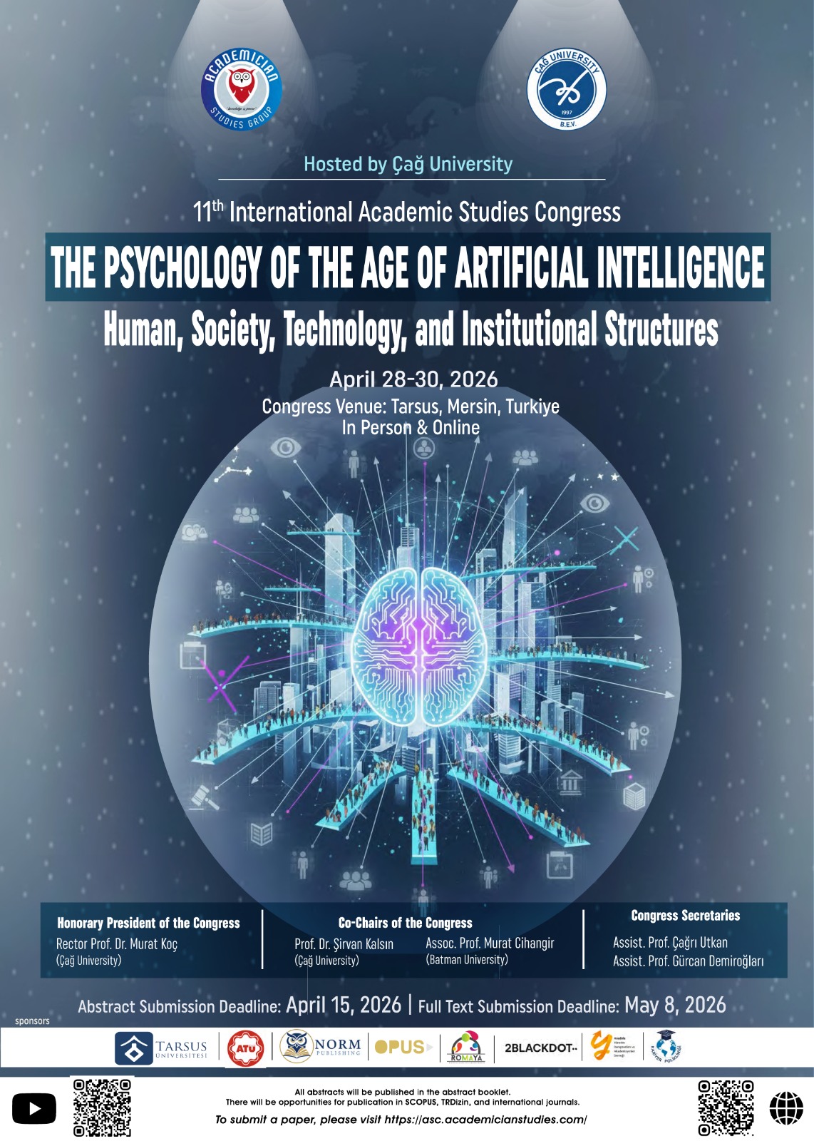 Çağ Üniversitesi Fen-Edebiyat Fakültesi ev sahipliğinde 28–29–30 Nisan 2026 tarihleri arasında “Yapay Zekâ Çağının Psikolojisi: İnsan, Toplum, Teknoloji ve Kurumsal Yapılar” temalı XI. ASC Akademik Çalışmalar Kongresi’ düzenlenecektir.