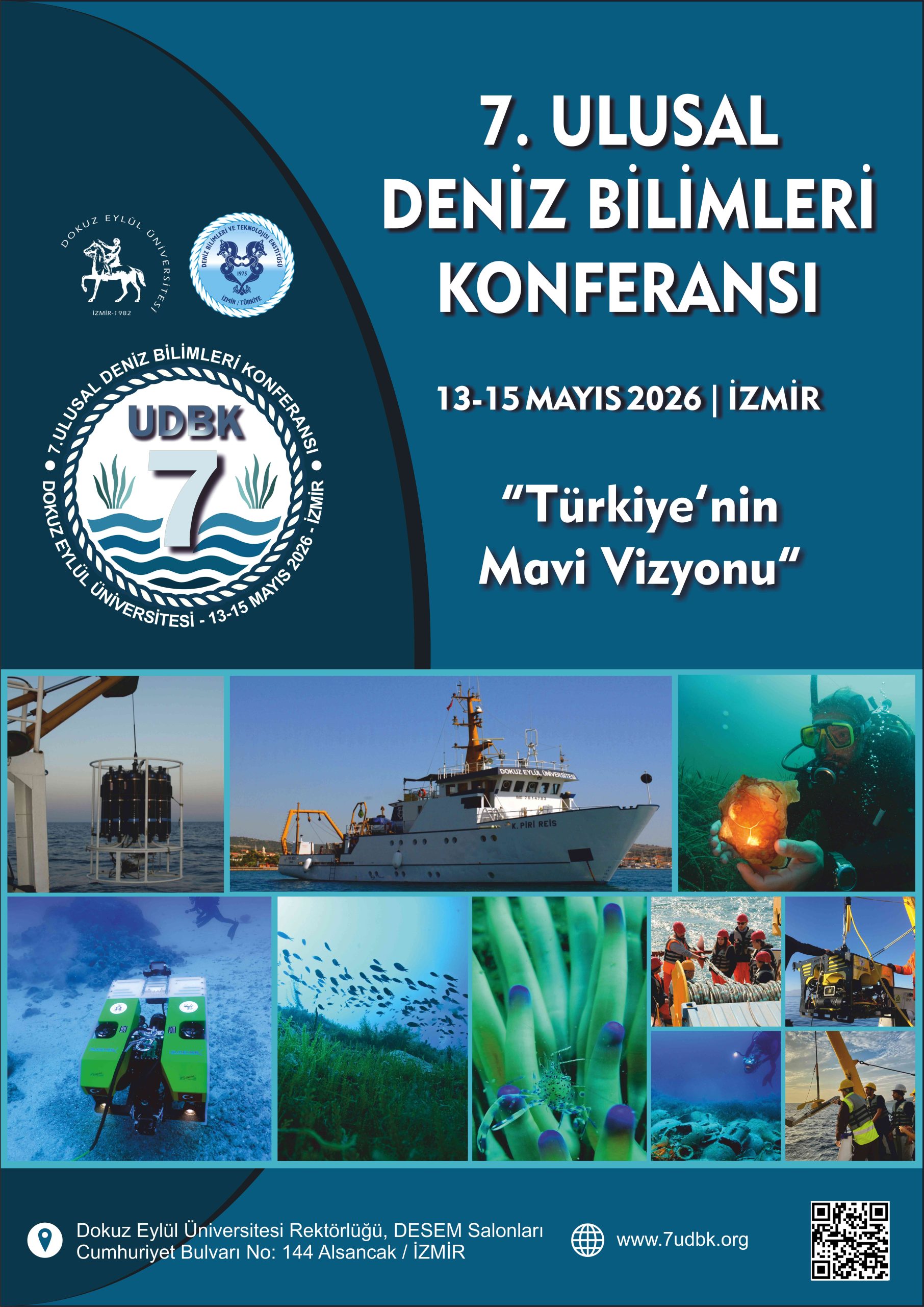 Dokuz Eylül Üniversitesi Deniz Bilimleri ve Teknolojisi Enstitüsü ev sahipliğinde, 13-15 Mayıs 2026 tarihleri arasında “Türkiye’nin Mavi Vizyonu: Deniz Bilimlerinde Yeni Ufuklar” temasıyla “7. Ulusal Deniz Bilimleri Konferansı” düzenlenecektir.