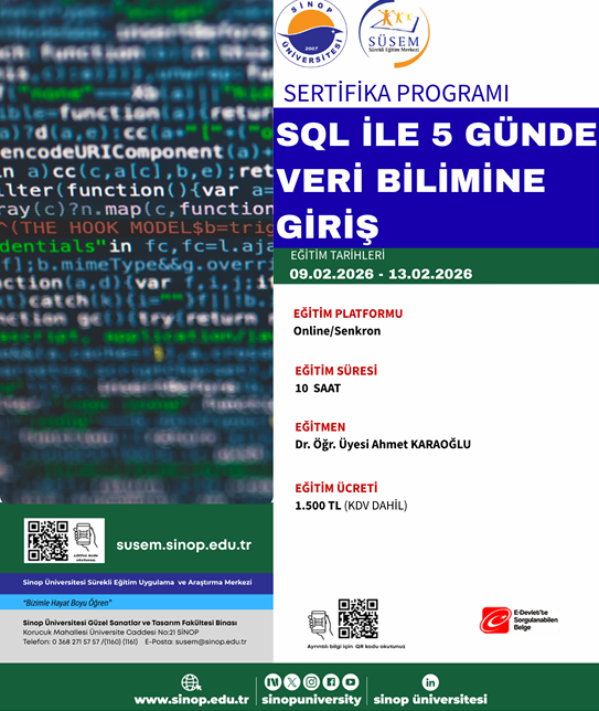 Sinop Üniversitesi Sürekli Eğitim Uygulama ve Araştırma Merkezi Müdürlüğü bünyesinde  “SQL İle 5 Günde Veri Bilimine Giriş” eğitimi düzenlenecektir.