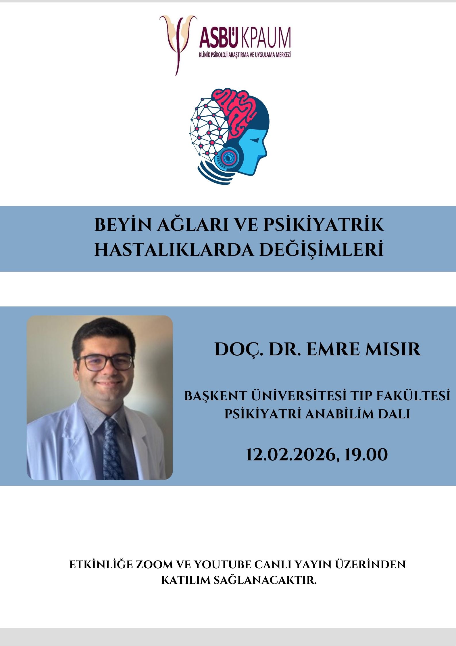 Ankara Sosyal Bilimler Üniversitesi ASBÜ Klinik Psikoloji Araştırma ve Uygulama Merkezi (KPAUM) bünyesinde; “Beyin Ağları ve Ruhsal Bozukluklarda Değişimler” başlıklı bir etkinlik düzenlenecektir. Söz konusu etkinlikte; Doç. Dr. Emre MISIR, “Beyin Ağları ve Psikiyatrik Hastalıklarda Değişimleri” konulu sunumunu gerçekleştirecektir. Webinar, 12 Şubat Perşembe günü saat 19.00’da çevrimiçi (online) platform üzerinden yapılacaktır.