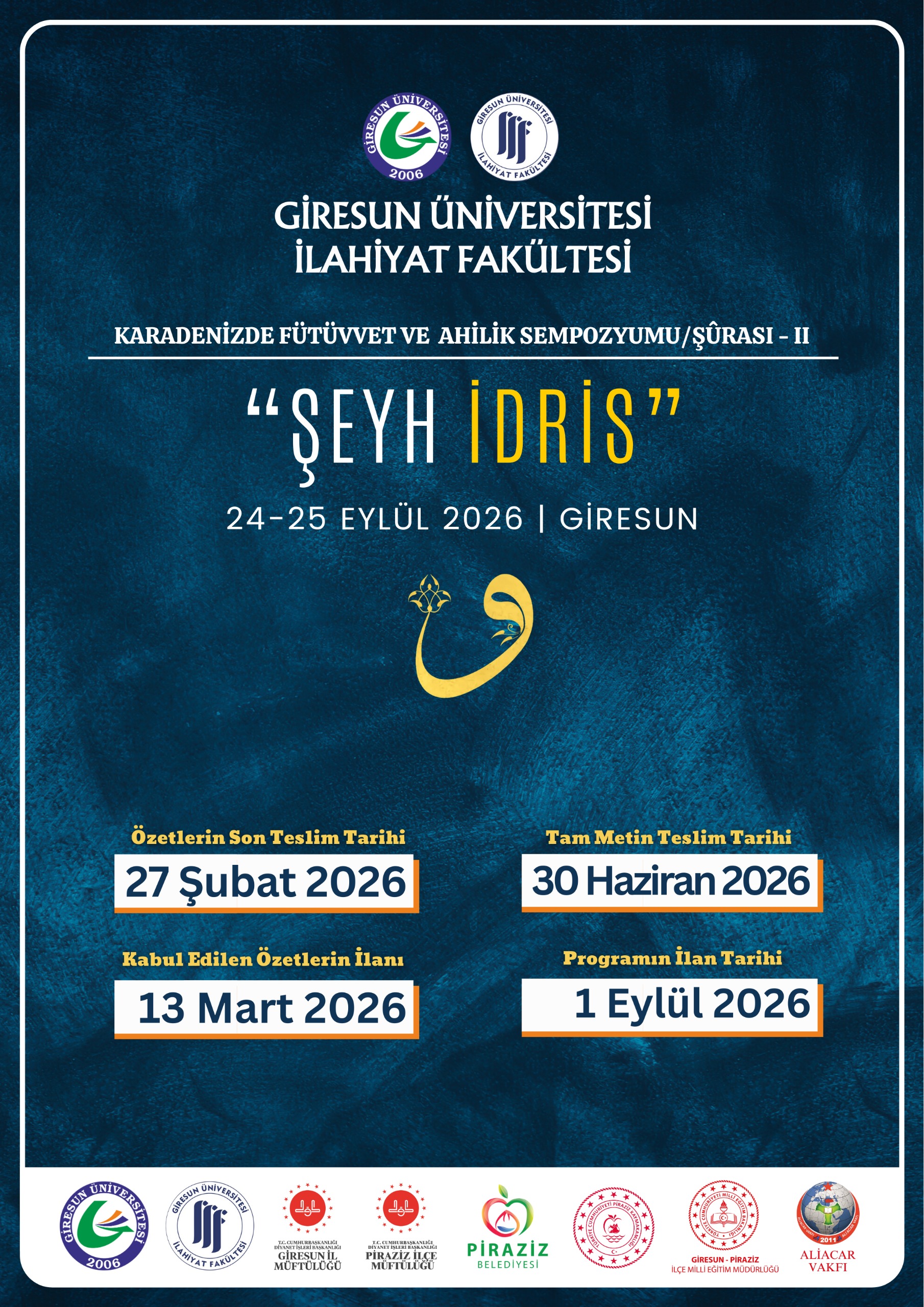 Giresun Üniversitesi İlahiyat Fakültesinin ev sahipliğinde, 24-25 Eylül 2026 tarihlerinde  “Karadenizde Fütüvvet ve Ahilik Sempozyumu/Şurası-II (Şeyh İdris)” konulu etkinlik düzenlenecektir.
