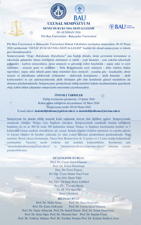 Piri Reis Üniversitesi Hukuk Fakültesi ve Bahçeşehir Üniversitesi Hukuk Fakültesi işbirliğinde, 09-10 Nisan 2026 tarihlerinde “Deniz Hukukunda Dijitalleşme” başlıklı ulusal sempozyum ve teknik gezi düzenlenmesi planlanmaktadır.