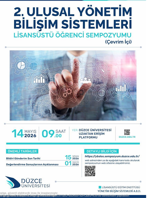 Düzce Üniversitesi ev sahipliğinde Lisansüstü Eğitim Enstitüsü Yönetim Bilişim Sistemleri Anabilim Dalı tarafından düzenlenecek olan “2.Ulusal Yönetim Bilişim Sistemleri Lisansüstü Öğrenci Sempozyumu” 14 Mayıs 2026 Perşembe günü gerçekleştirilecektir.