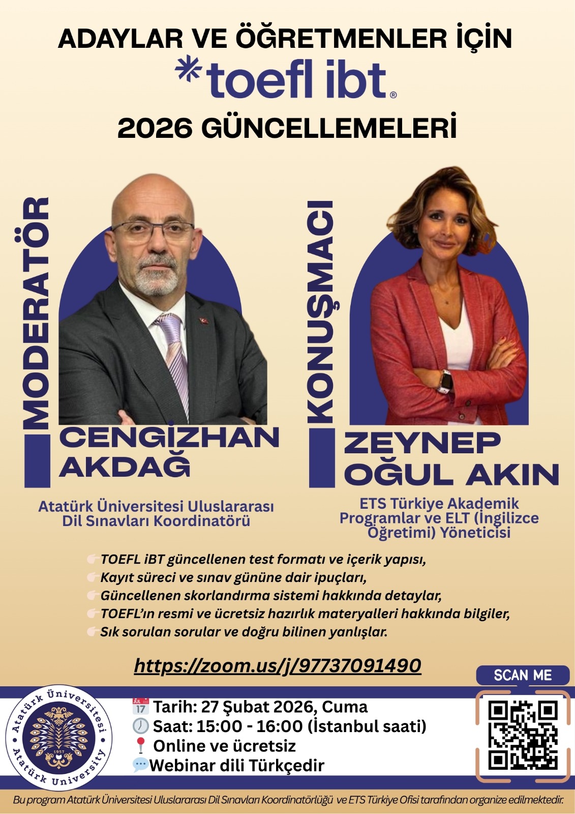 Atatürk Üniversitesi Uluslararası Dil Sınavları Koordinatörlüğü (TOEFL iBT Resmi Sınav Merkezi) ve ETS Türkiye Ofisi iş birliği ile TOEFL iBT sınavlarında 21 Ocak 2026 tarihinden itibaren uygulanmaya başlayan güncellemeler hakkında sınava girecek adaylara ve adayları sınavlara hazırlayan eğitimcilere yönelik bilgilendirme semineri düzenlenecektir.