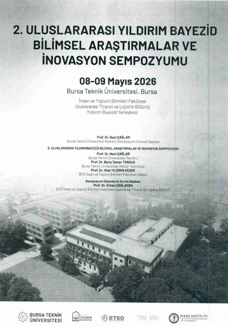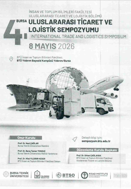 Bursa Teknik Üniversitesi İnsan ve Toplum Bilimleri Fakültesi Uluslararası Ticaret ve Lojistik bölümü tarafından geleneksel hale gelmiş 4. Bursa Uluslararası Ticaret ve Lojistik Sempozyumu 8 Mayıs 2026 tarihinde ve 2.Uluslararası Yıldırım Beyazıd Bilimsel Araştırmalar ve İnovasyon Sempozyumu 8-9 Mayıs 2026 tarihlerinde düzenlenecektir. Sempozyum Uluslararası nitelikli ve akademik teşvik koşullarını sağlayacak şekilde yüz yüze ve çevrim içi olarak gerçekleştirilecektir.