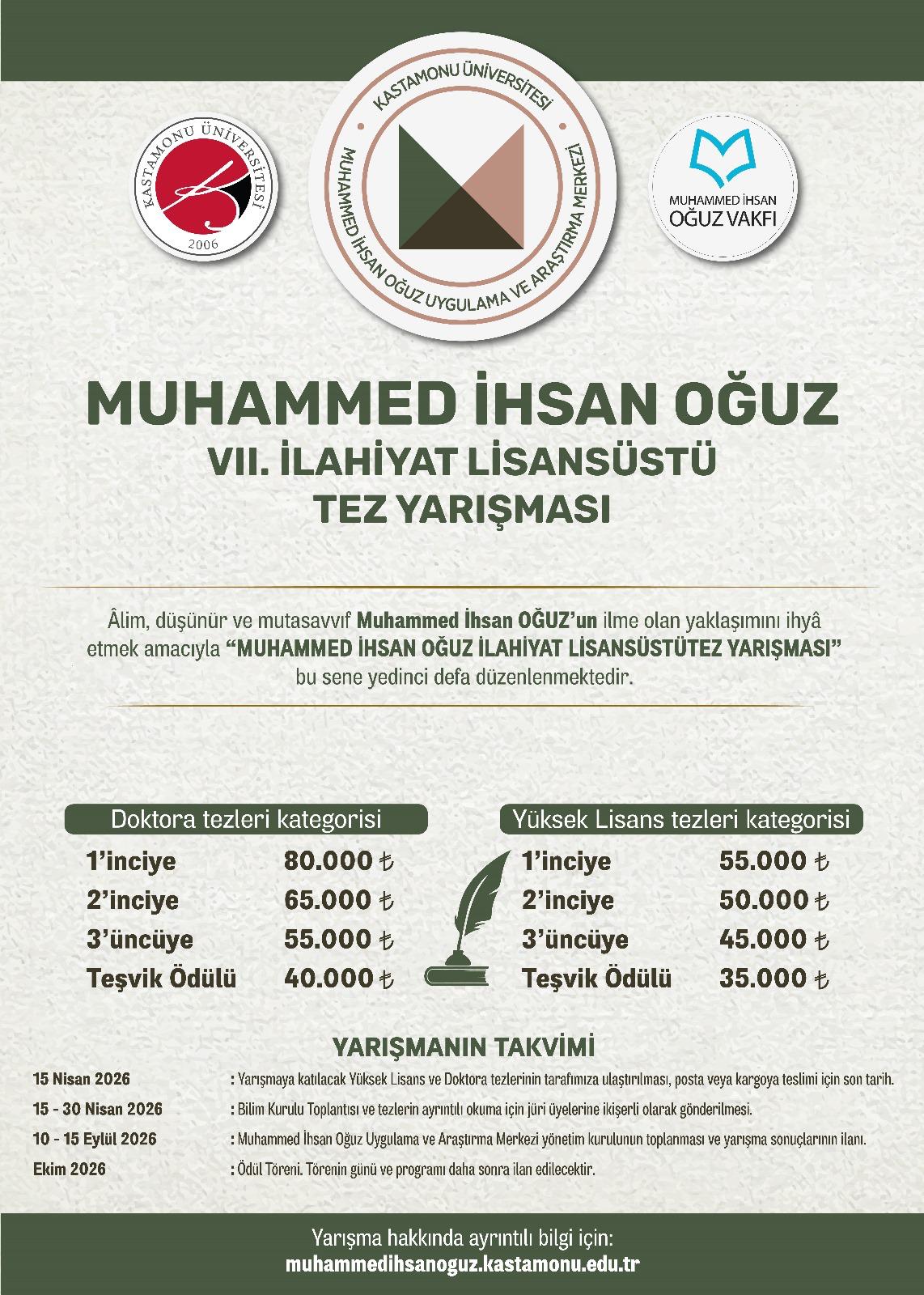 Kastamonu Üniversitesi Muhammed İhsan Oğuz Uygulama ve Araştırma Merkezi ve İlahiyat Fakültesi tarafından “Muhammed İhsan Oğuz İlahiyat Araştırma Ödülleri Yarışması” Ülkemiz çapında hazırlanan Yüksek Lisans ve Doktora Çalışmalarını değerlendirip müelliflerini ödüllendirecektir. Bu yıl yedincisi gerçekleştirilecek olan yarışmanın başvuruları başlamıştır.