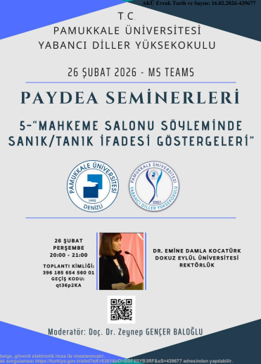 Pamukkale Üniversitesi Yabancı Diller Yüksekokulu Akademik ve Sosyal Aktivite Koordinatörlüğünün 2025-2026 Eğitim Öğretim Yılında Microsoft Teams platformu üzerinden çevrim içi olarak düzenleyeceği Pamukkale Üniversitesi Yabancı Diller Yüksekokulu Dil ve Edebiyat Araştırmaları (PAYDEA) seminerlerinin beşincisi “Mahkeme Salonu Söyleminde Sanık/Tanık İfadesi Göstergeleri” adlı seminer 26 Şubat 2026 tarihinde saat 20.00’de gerçekleştirilecektir.
