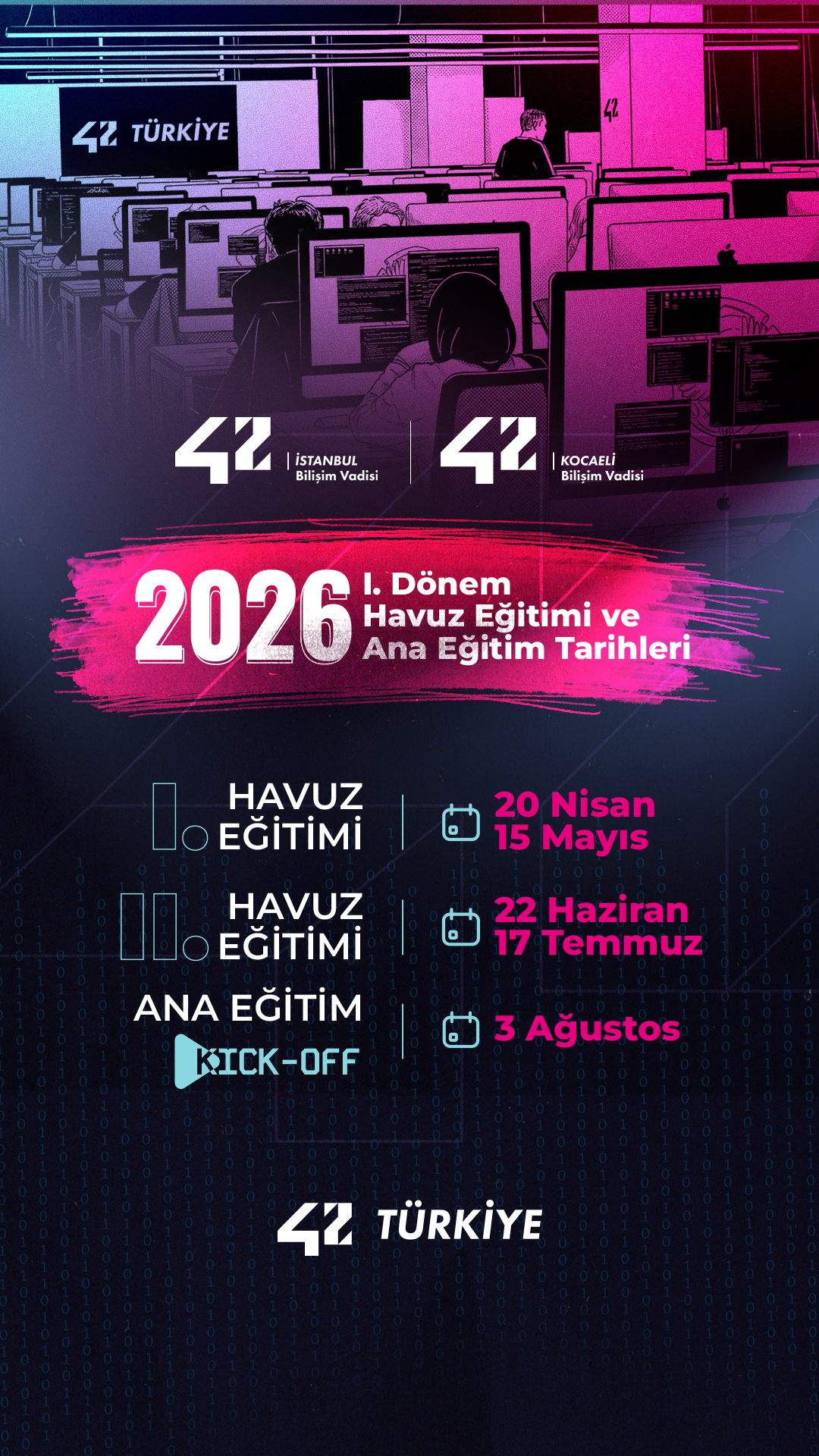 Sanayi ve Teknoloji Bakanlığı himayelerinde ve Bilişim Vadisi yürütücülüğünde faaliyet gösteren 42 Türkiye; yazılım alanında nitelikli insan kaynağının yetiştirilmesine katkı sağlamak amacıyla tamamen ücretsiz ve yenilikçi bir eğitim modeli sunmaktadır. Proje tabanlı ve akran öğrenimine dayalı eğitim yaklaşımıyla yürütülen program, Milli Teknoloji Hamlesi hedefleri doğrultusunda ülkemizin yazılım geliştirici ihtiyacının karşılanmasına katkı sağlamayı amaçlamaktadır. 2026 yılı eğitim dönemine ilişkin başvuru süreci ve eğitim programı planlanmıştır.
