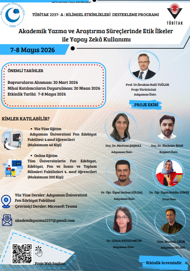 Adıyaman Üniversitesi Fen-Edebiyat Fakültesi Türk Dili ve Edebiyatı Bölümü öğretim üyesi Prof. Dr. İbrahim Halil TUĞLUK’un yürütücüsü olduğu “Akademik Yazma ve Araştırma Süreçlerinde Etik İlkeler ile Yapay Zekâ Kullanımı” başlıklı proje, TÜBİTAK 2237-A Bilimsel Eğitim Etkinliklerini Destekleme Programı kapsamında kabul edilmiş olup konuya ilişkin bir eğitim etkinliği gerçekleştirilmesi planlanmaktadır.