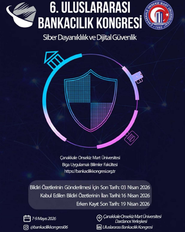 Çanakkale Onsekiz Mart Üniversitesi Biga Uygulamalı Bilimler Fakültesi tarafından Finans ve Bankacılık Bölümü tarafından, 7-9 Mayıs 2026 tarihleri arasında “6. Uluslararası Bankacılık Kongresi” gerçekleştirilecektir.