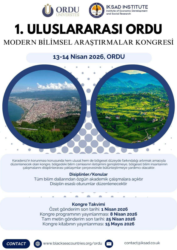 Ordu Üniversitesi ile İktisadi Kalkınma ve Sosyal Araştırmalar (İKSAD) Enstitüsü iş birliğinde 13-14 Nisan 2026 tarihleri arasında Ordu Üniversitesi Tıp Fakültesi Morfoloji Binası Konferans Salonunda yüz yüze ve online olarak tüm bilim dallarından özgün akademik çalışmalara açık “1. Uluslararası Ordu Modern Bilimsel Araştırmalar Kongresi” gerçekleştirilecektir.