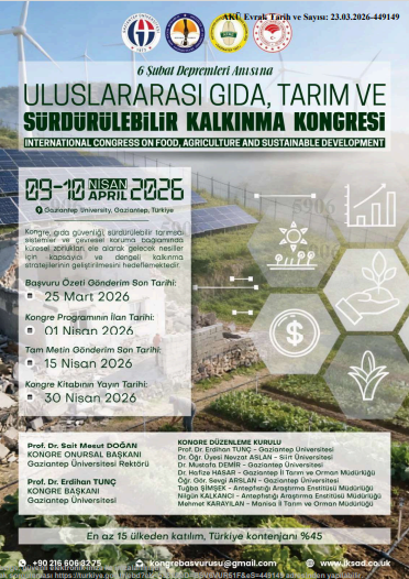 Gaziantep Üniversitesi Fen Edebiyat Fakültesi Biyoloji Bölümü Öğretim Üyelerinden Prof.Dr. Erdihan Tunç, Üniversitenin ev sahipliğinde 9-10 Nisan 2026 tarihlerinde çevrim içi olarak “Uluslararası Gıda, Tarım ve Sürdürülebilir Kalkınma Kongresi” düzenleyecektir.