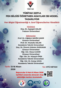 Trabzon Üniversitesi Fatih Eğitim Fakültesi Matematik ve Fen Bilimleri Eğitimi Bölümü Kimya Eğitimi Anabilim Dalı öğretim üyesi Doç. Dr. Ayşegül ASLAN, TÜBİTAK-BİDEB 2237-A Bilimsel Eğitim Etkinliklerini Destekleme Programı kapsamında desteklenen ve yürütücülüğünü yaptığı “Fen Bilgisi Öğretmen Adayları 3B Model Tasarlıyor” başlıklı projeyi 13-16 Nisan 2026 tarihleri arasında Karadeniz Teknik Üniversitesi Medikal Cihaz Tasarım ve Üretim Uygulama ve Araştırma Merkezi’nde gerçekleştirecektir.