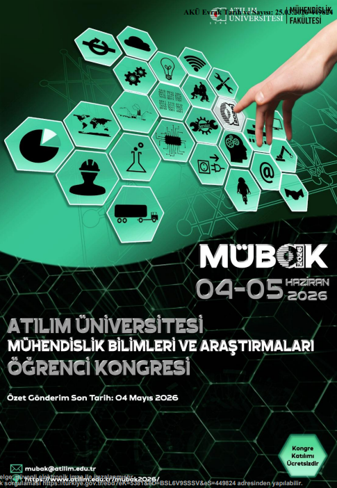 Atılım Üniversitesi Mühendislik Fakültesi tarafından bu yıl dördüncüsü düzenlenen “Atılım Üniversitesi Mühendislik Bilimleri ve Araştırmaları Öğrenci Kongresi (MÜBAK 2026)” 4-5 Haziran 2026 tarihlerinde gerçekleştirilecektir.