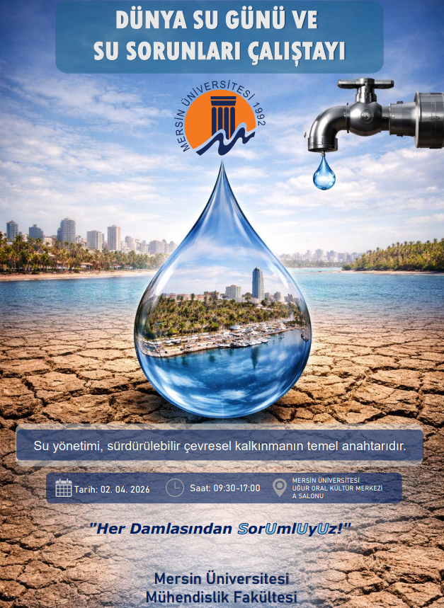 Mersin Üniversitesi Mühendislik Fakültesi Çevre Mühendisliği Bölümü tarafından 02 Nisan 2026 tarihinde Prof. Dr. Uğur ORAL Kültür Merkezi A salonunda “Dünya Su Günü ve Su Sorunları Çalıştayı” düzenlenecektir.