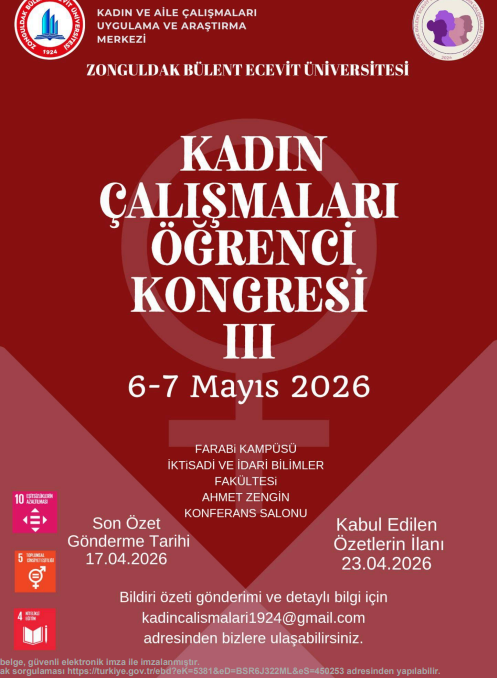 Zonguldak Bülent Ecevit Üniversitesi Kadın ve Aile Çalışmaları Uygulama ve Araştırma Merkezi ile Kadın Çalışmaları Öğrenci Topluluğu ortaklığında 6-7 Mayıs 2026 tarihlerinde İktisadi ve İdari Bilimler Fakültesi Ahmet Zengin Konferans Salonu’nda “III. Kadın Çalışmaları Öğrenci Kongresi” gerçekleşmektedir.