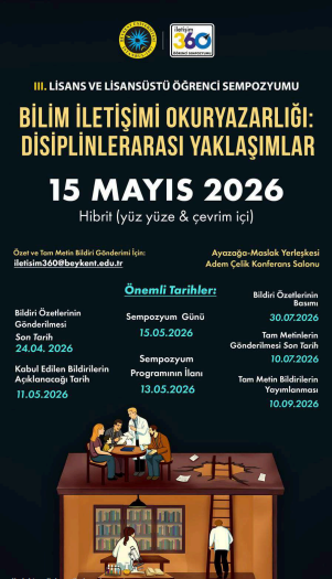 İstanbul Beykent Üniversitesi İletişim Fakültesi ev sahipliğinde düzenlenecek olan III. Lisans ve Lisansüstü Öğrenci Sempozyumu, bu yıl “Bilim İletişimi Okuryazarlığı: Disiplinlerarası Yaklaşımlar” temasıyla 15 Mayıs 2026 tarihinde gerçekleştirilecektir.