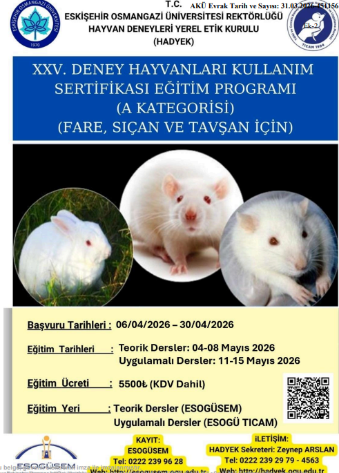 Eskişehir Osmangazi Üniversitesi Tıbbi Cerrahi Deney Hayvanları Uygulama ve Araştırma Merkezi (TICAM) ve Hayvan Deneyleri Yerel Etik Kurulu tarafından (HADYEK) 04 – 15 Mayıs 2026 tarihleri arasında “Araştırıcılara Yönelik (A Sınıfı; Sıçan, Fare, Tavşan)Deney Hayvanları Kullanım Sertifikası Kursu” planlanmıştır.