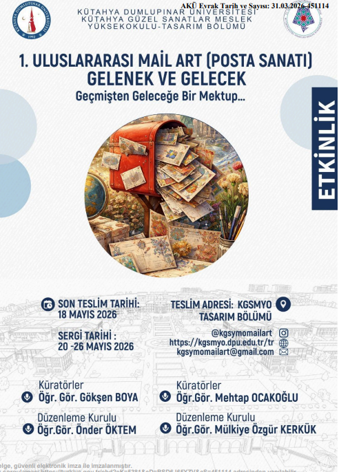 Kütahya Dumlupınar Üniversitesi Kütahya Güzel Sanatlar Meslek Yüksekokulu tarafından 20-26 Mayıs 2026 tarihleri arasında KGSMYO Sergi Salonu’nda ‘’1. Uluslararası Mail Art (Posta Sanatı) Gelenek ve Gelecek Sergisi”nin düzenlenmesi planlanmaktadır.