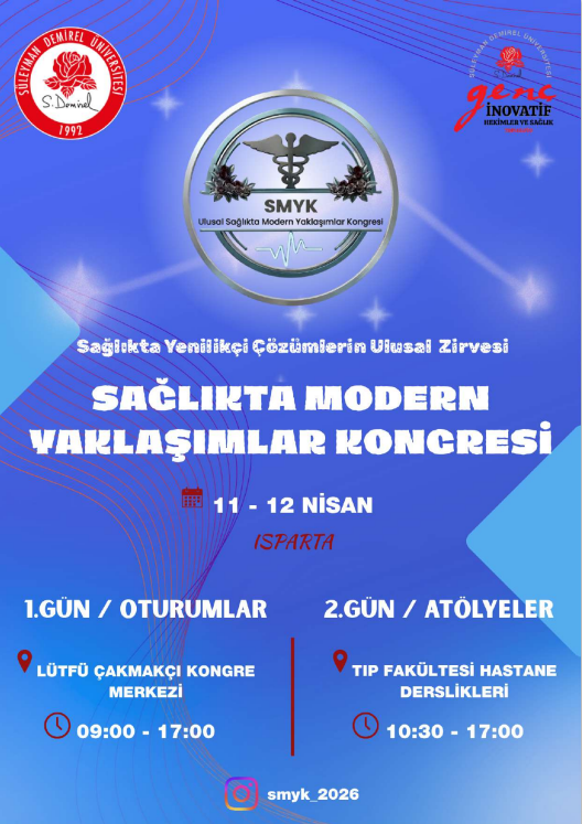 Süleyman Demirel Üniversitesi Sağlık Kültür ve Spor Daire Başkanlığı bünyesinde faaliyet gösteren Genç İnovatif Hekimler ve Sağlık Topluluğu tarafından, 11-12 Nisan 2026 tarihlerinde “1. Ulusal Sağlıkta Modern Yaklaşımlar (SMYK)” isimli öğrenci kongresi düzenlenecektir.