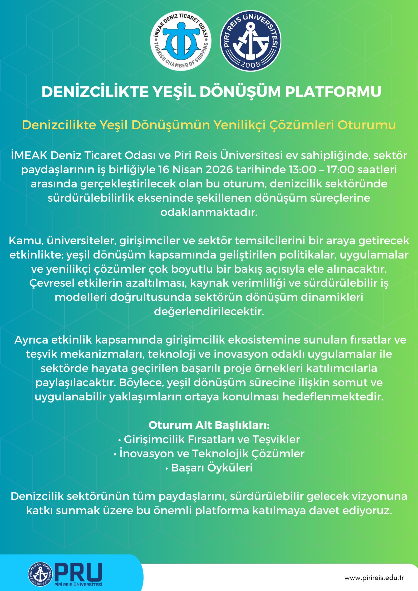 İMEAK Deniz Ticaret Odası ve Piri Reis Üniversitesi ev sahipliğinde, sektör paydaşlarının iş birliğiyle 16 Nisan 2026 tarihinde 13.00–17.00 saatleri arasında gerçekleştirilecek olan “Denizcilikte Yeşil Dönüşümün Yenilikçi Çözümleri Oturumu”, denizcilik sektöründe sürdürülebilirlik ekseninde şekillenen dönüşüm süreçlerine odaklanmaktadır.